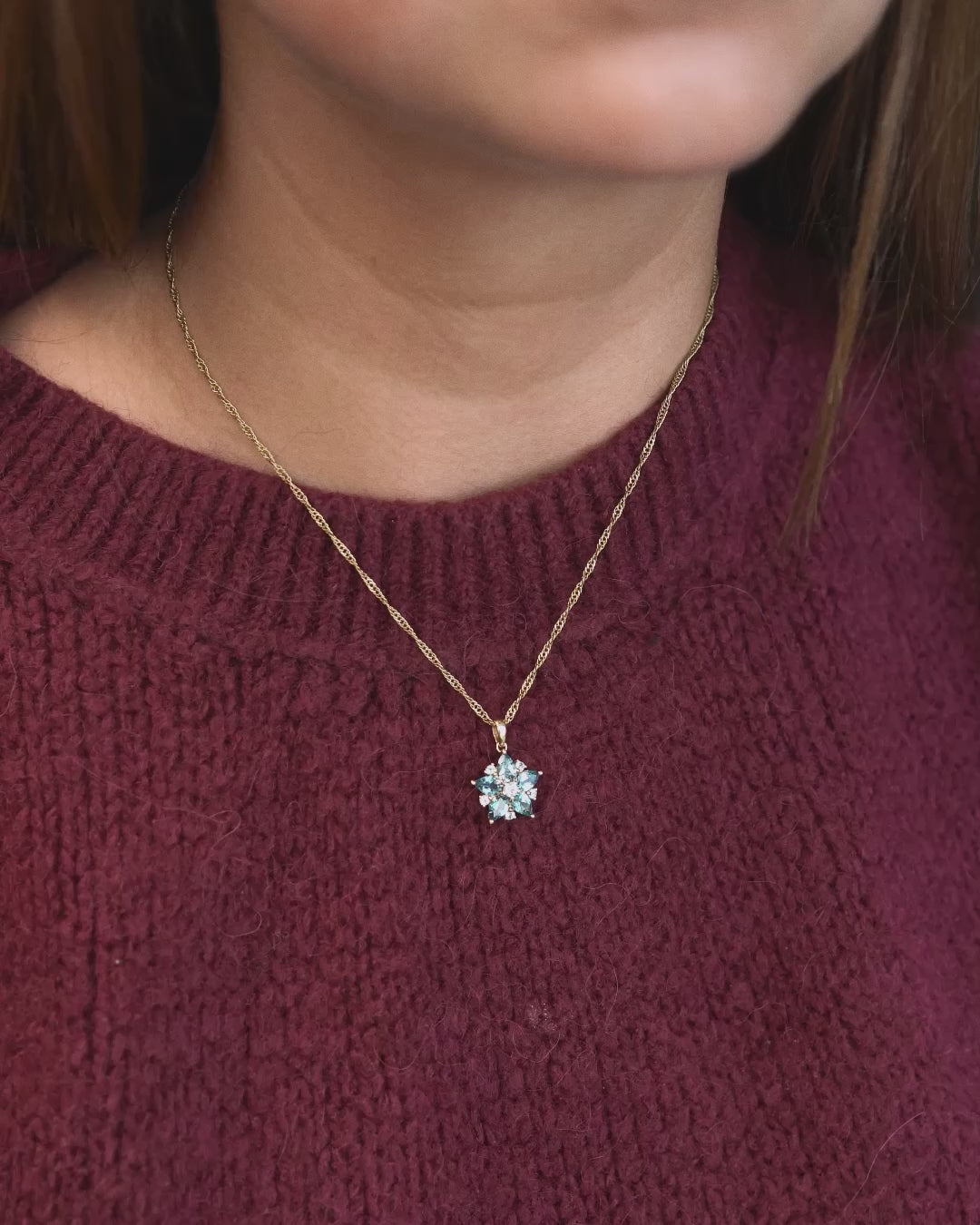 Een fonkelend hemelsblauw middelpunt dat het licht op magische wijze vangt — deze elegante hanger met blauwe topaas straalt verfijning en sereniteit uit. De cluster zetting versterkt het natuurlijke spel van licht, waardoor de steen lijkt te gloeien van binnenuit. Een klassiek, vrouwelijk ontwerp dat elke outfit verheft met subtiele luxe.