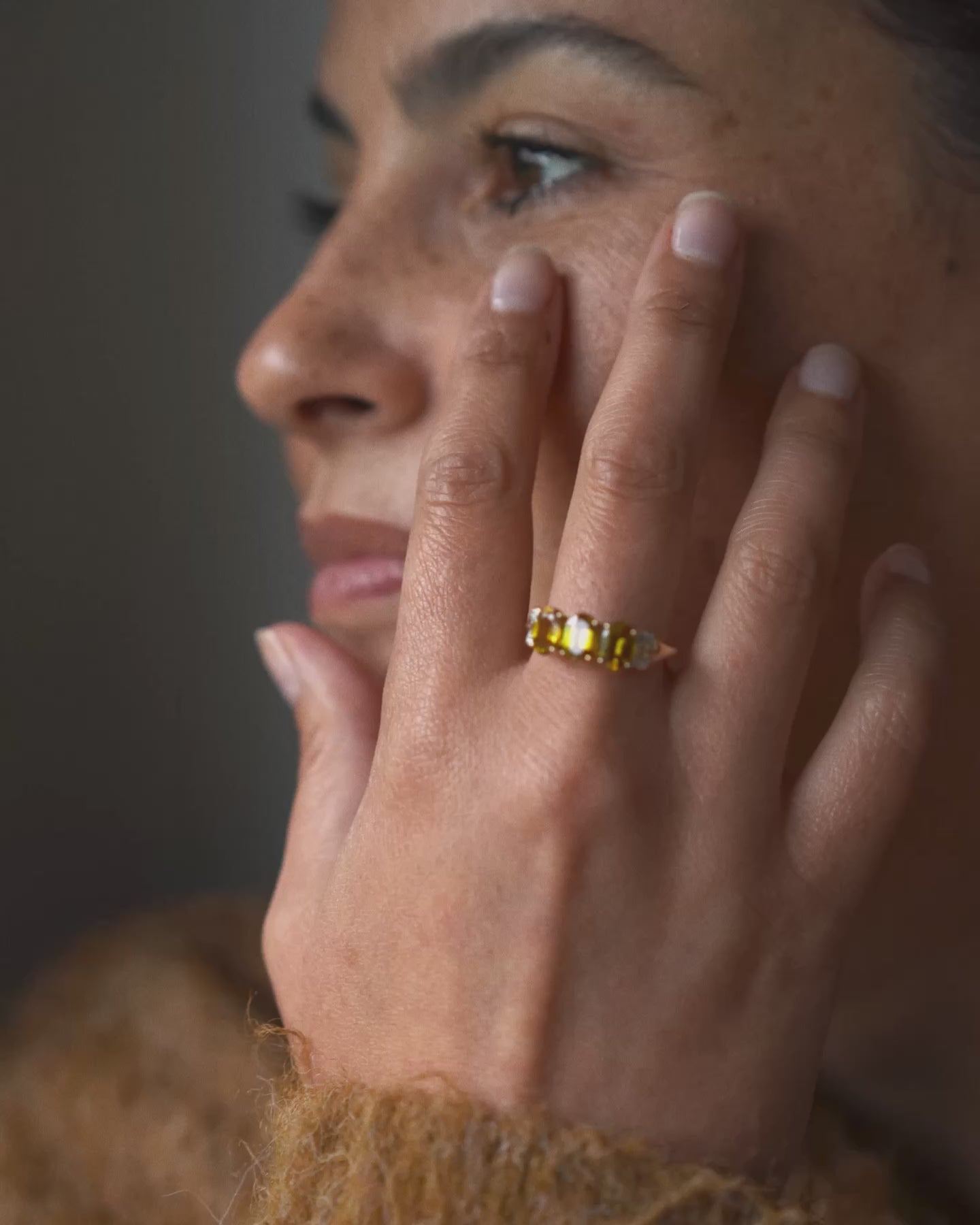 De Yvette ring vangt het licht op betoverende wijze met haar levendige gele sfenen, ook wel bekend om hun uitzonderlijke vuur en schittering. De drie fonkelende stenen worden subtiel geaccentueerd door kleine diamanten, die het warme 9k montuur nog meer laten stralen. Deze driesteenring is een symbool van elegantie en energie, met een sprankeling die nooit onopgemerkt blijft. Dit bijzondere stuk werd met de hand uitgekozen bij een van de juweliers uit Menina’s wereldwijde netwerk, en is nu aangekomen in Amsterdam, klaar om een nieuw verhaal te beginnen met zijn toekomstige eigenares.